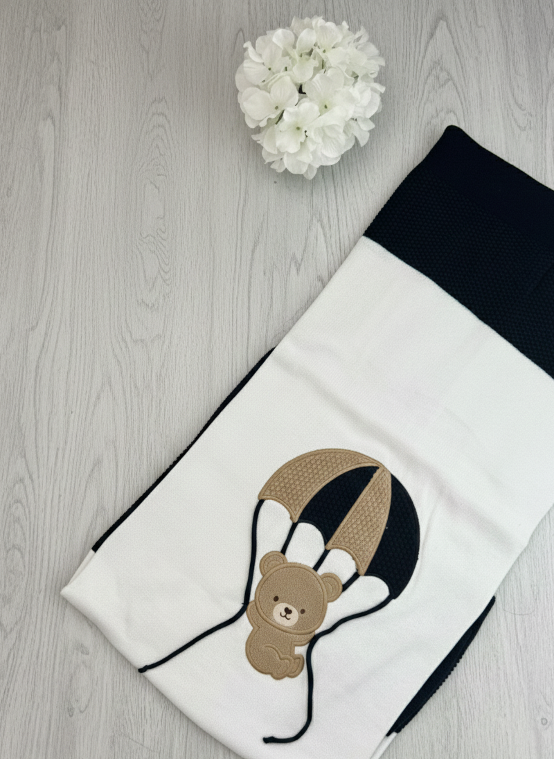 Soft, timeless, and thoughtfully crafted, this blanket features a delicate white and navy blue palette with an embroidered teddy bear floating gently beneath a parachute. Made from breathable, baby-soft knit fabric, it offers comfort, warmth, and an heirloom feel—perfect for everyday wear or a meaningful first gift.