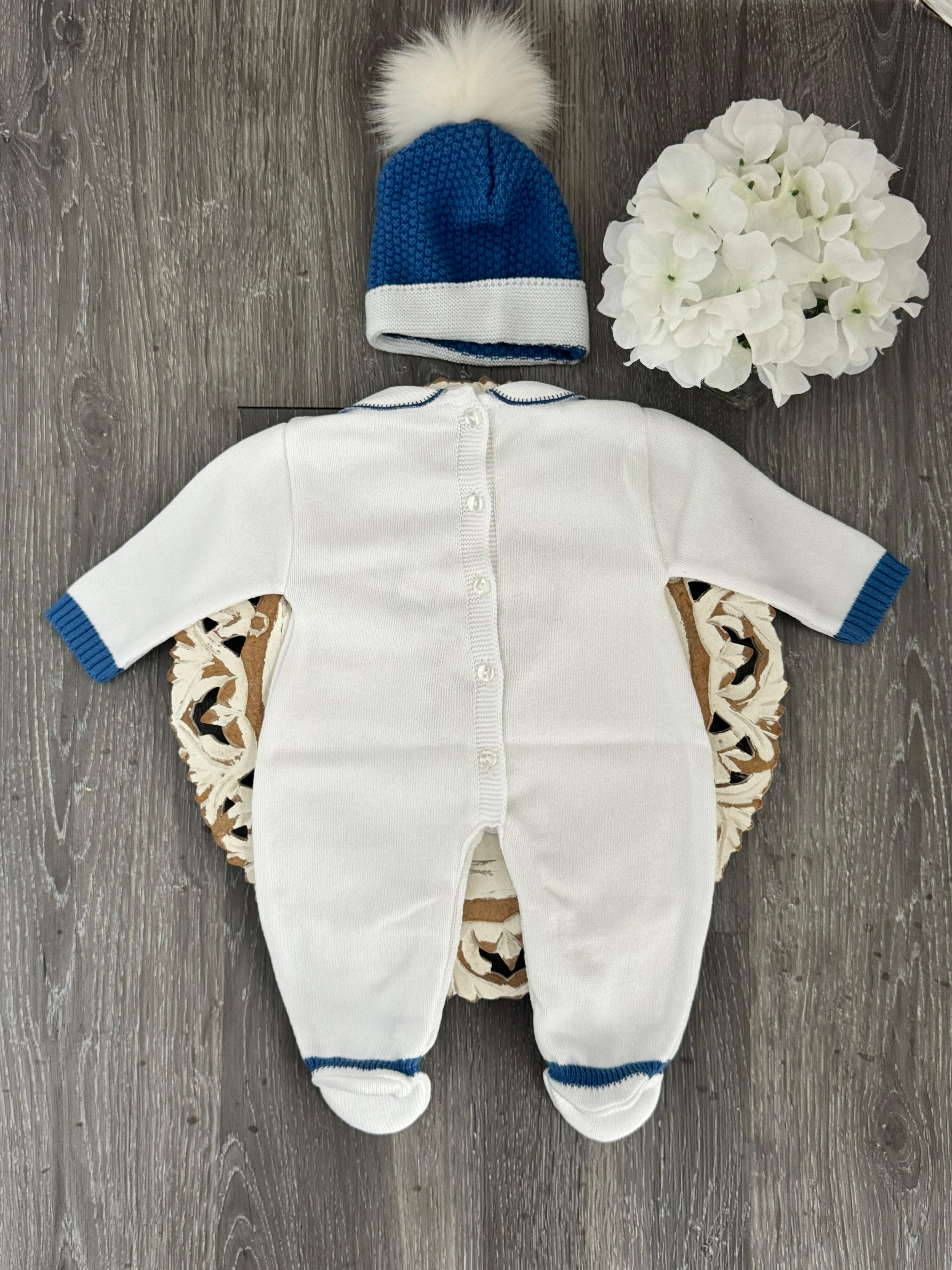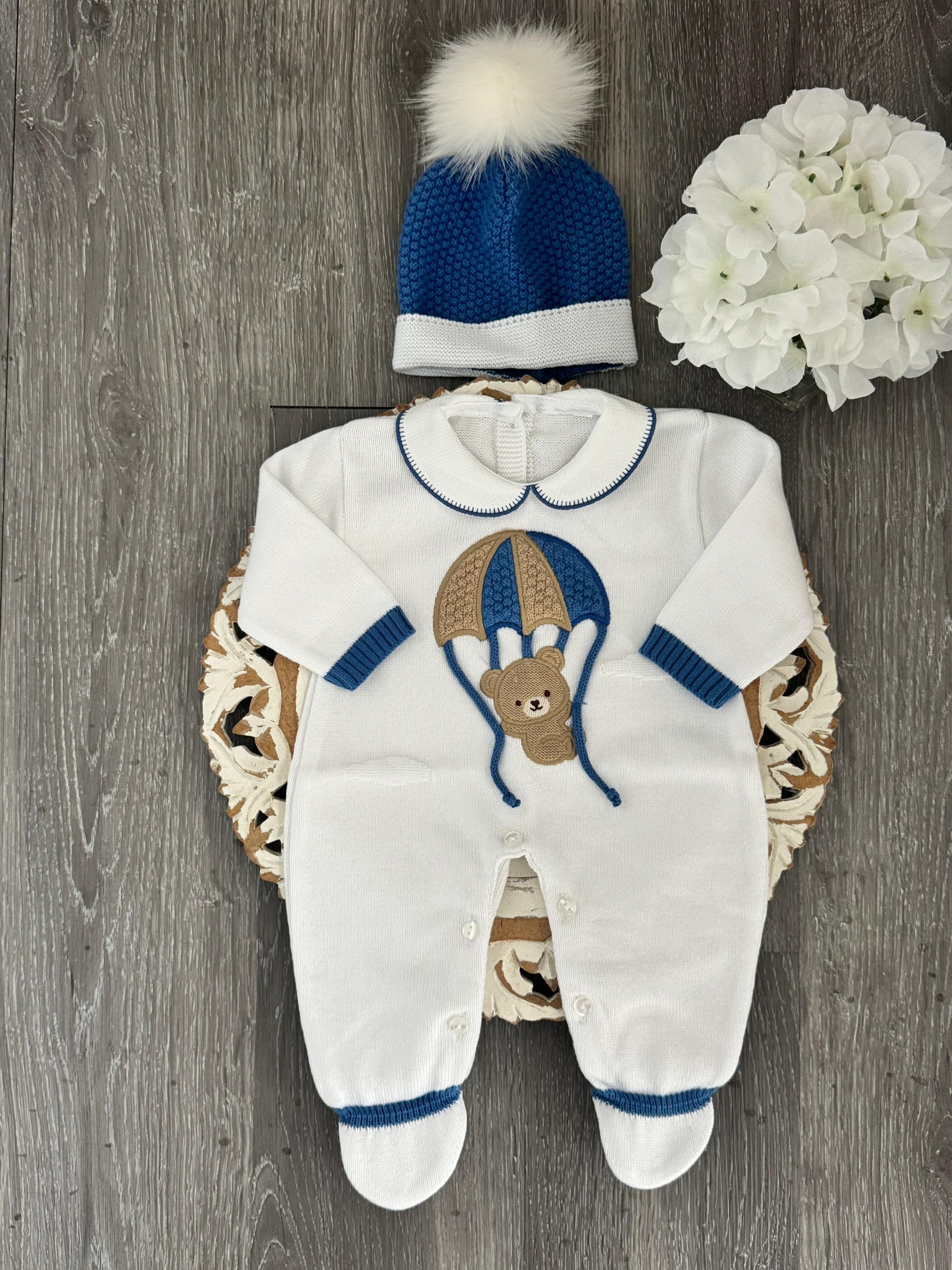 Soft, timeless, and thoughtfully crafted, this romper features a delicate white and blue palette with an embroidered teddy bear floating gently beneath a parachute. Made from breathable, baby-soft knit fabric, it offers comfort, warmth, and an heirloom feel—perfect for everyday wear or a meaningful first gift.