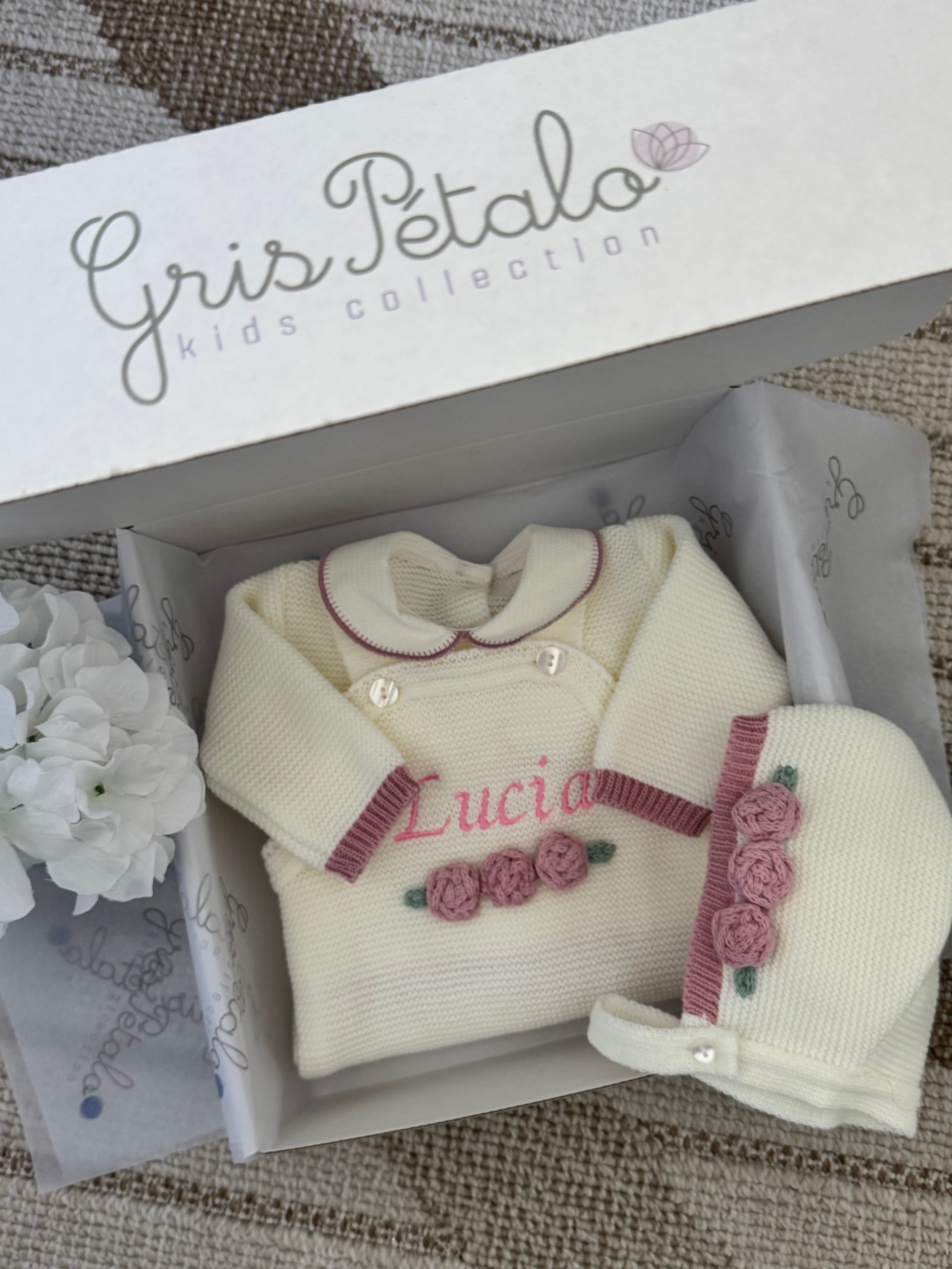 Knit Roses Romper Set in Ivory and Old Pink