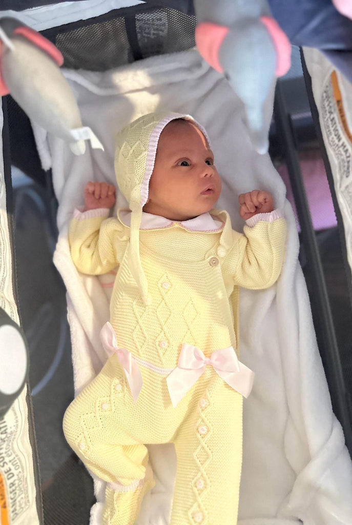 - Yellow and Pink details with matching bonnet with double delicate satin bows