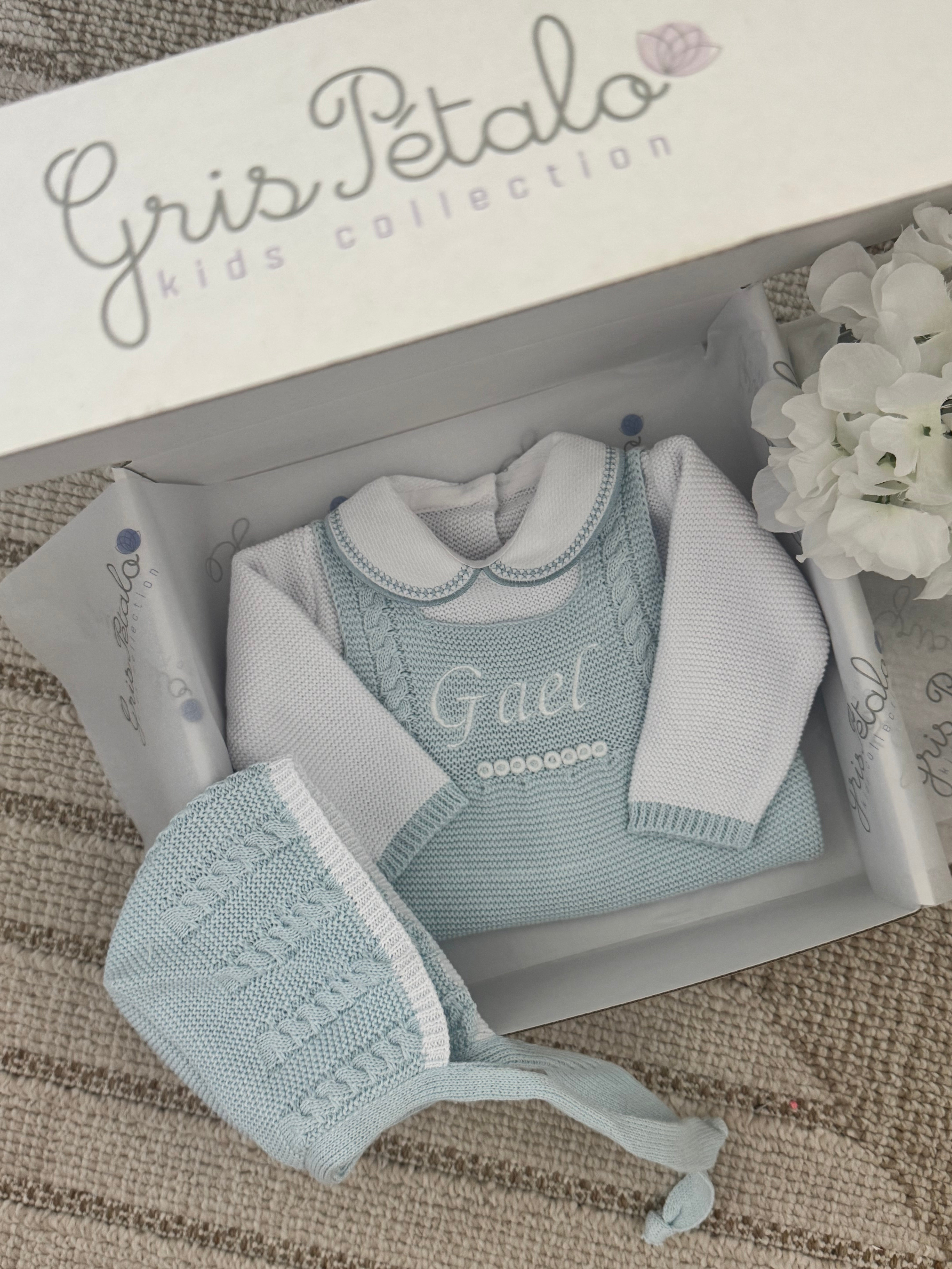Cable Knit Suspenders Style With Ruffle Collar Baby Knitted Romper in Sky Blue and White