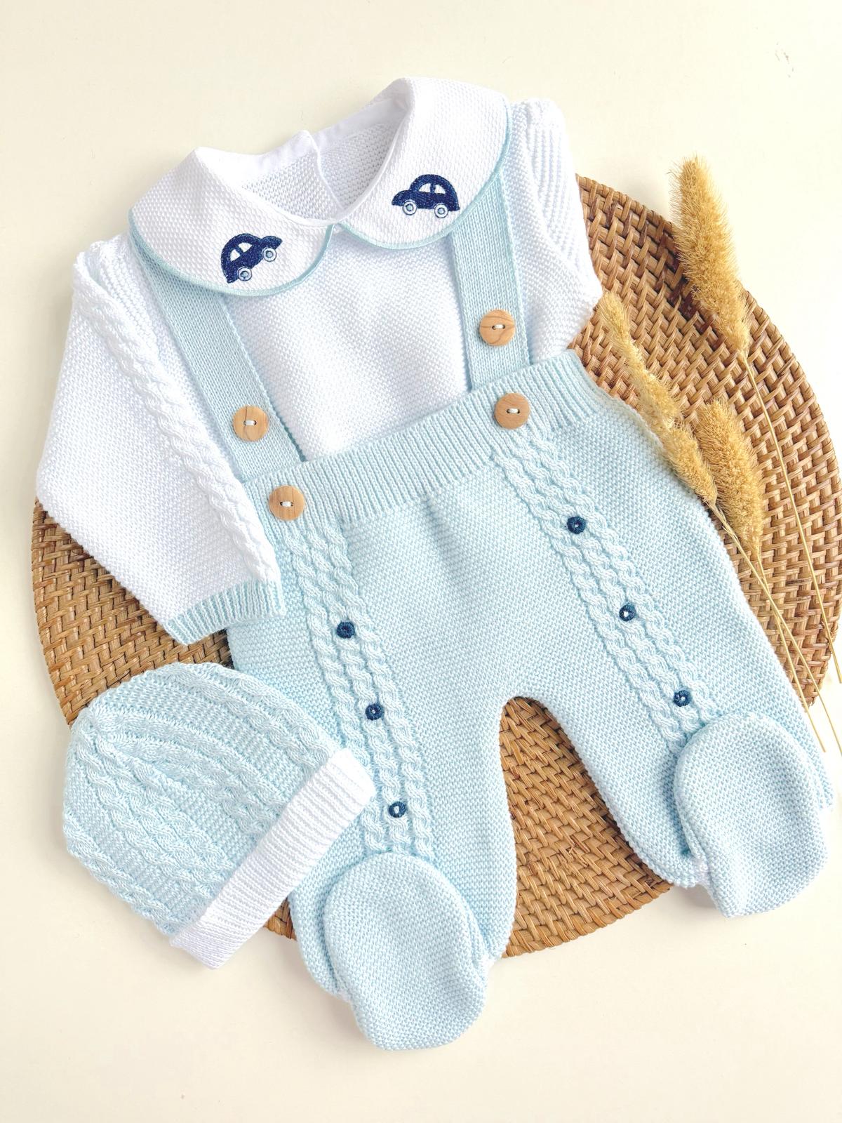 A timeless knit romper featuring a charming toy car motif, thoughtfully crafted for comfort, softness, and elegance.