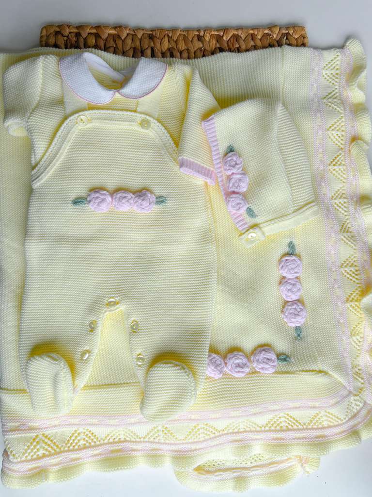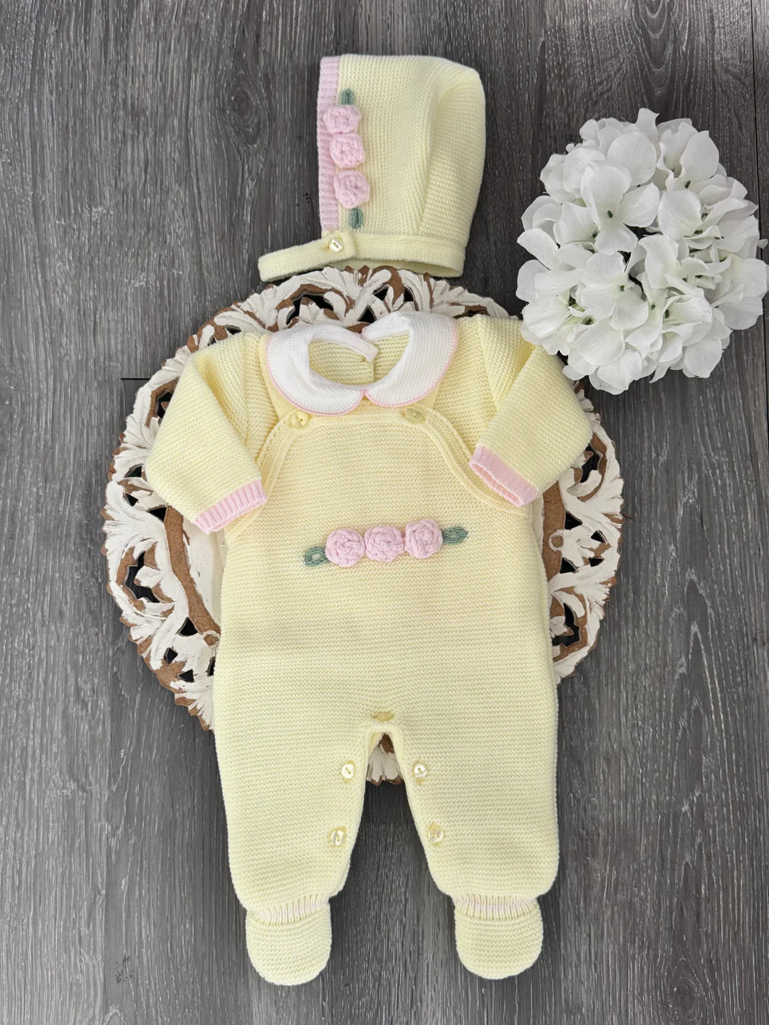 - Knit roses set in Yellow and pink with matching bonnet and hand made knit pink roses details