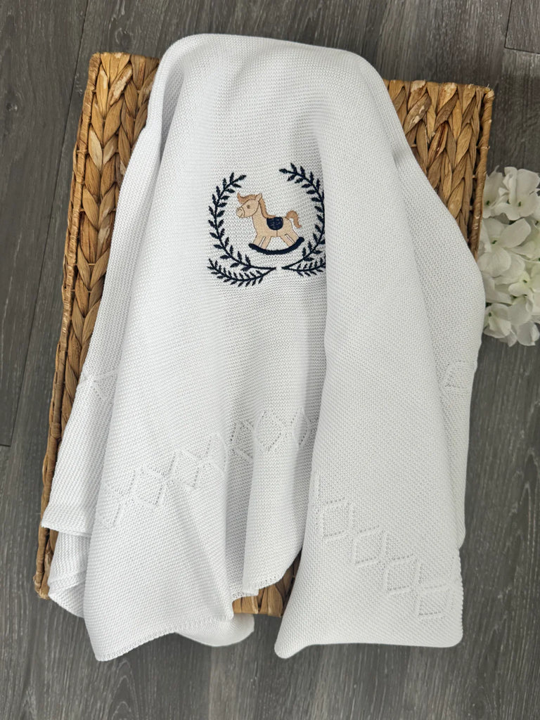 - Knit blanket in White color with navy blue embroidered rocking horse and details