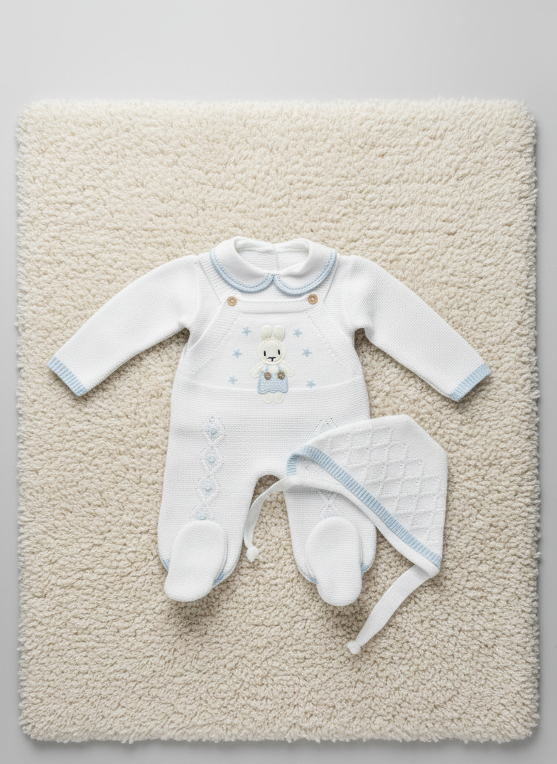 Star Bunny Romper Knit Set In White and Sky Blue