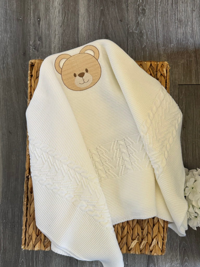 Teddy Hugs Baby Knit Blanket in White
