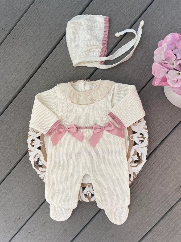 - Double bow romper in ivory color with old pink details and matching bonnet
