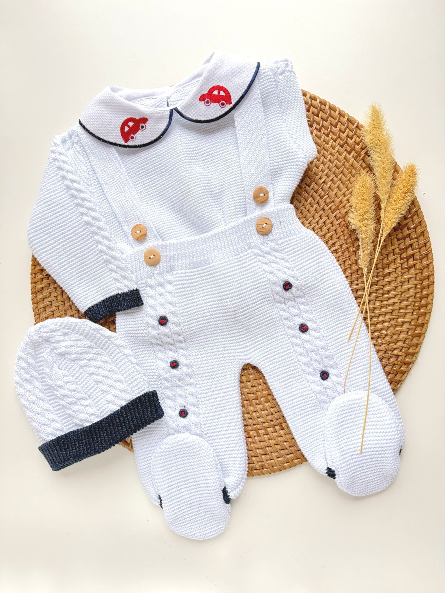 - Navy Blue and white with matching hat with blue toy car embroidered on collar